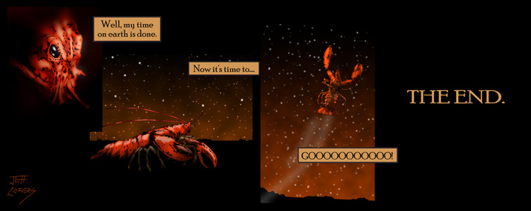 The last comic. Quite a day. How can I wrap up over three years of work in one newspost? What can I say here that will make everything come together? Is there anything I can put down in words that isn't captured in this, Lobster-Doctor's final moments on earth?
